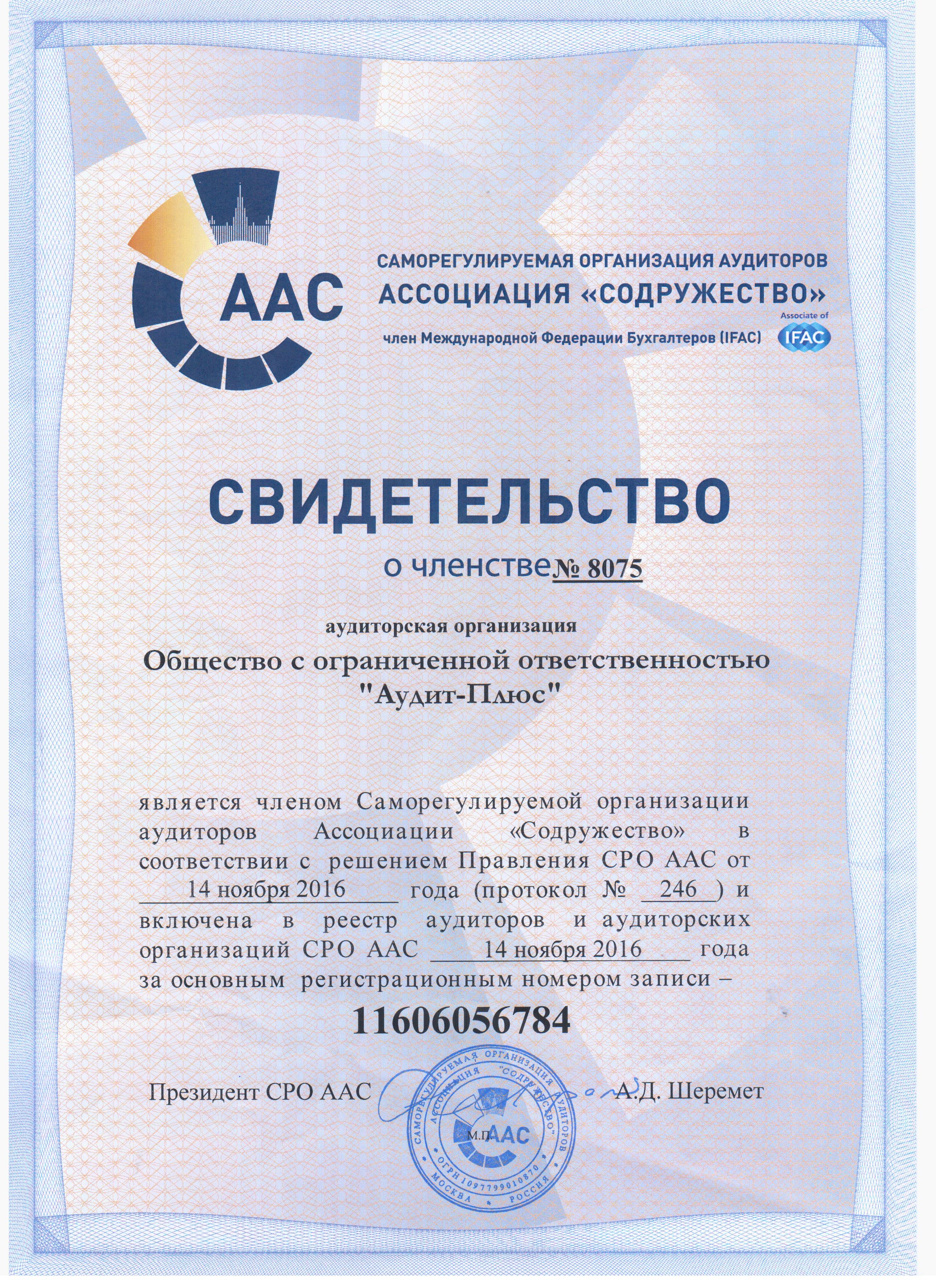 Свидетельство о членстве № 8075, включение в Реестр СРО ААС 14.11.2016г