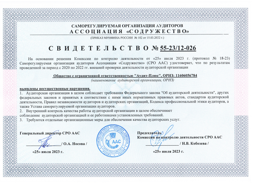 6. В 2023 году Саморегулируемой организацией аудиторов Ассоциацией «Содружество» проведен внешняя проверка деятельности ООО «Аудит-Плюс». На основании решения Комиссии по контролю деятельности от 25 июля 2023 г. (протокол № 18-23) удостоверено, что по результатам внешней проверки выявлены несущественные нарушения.»